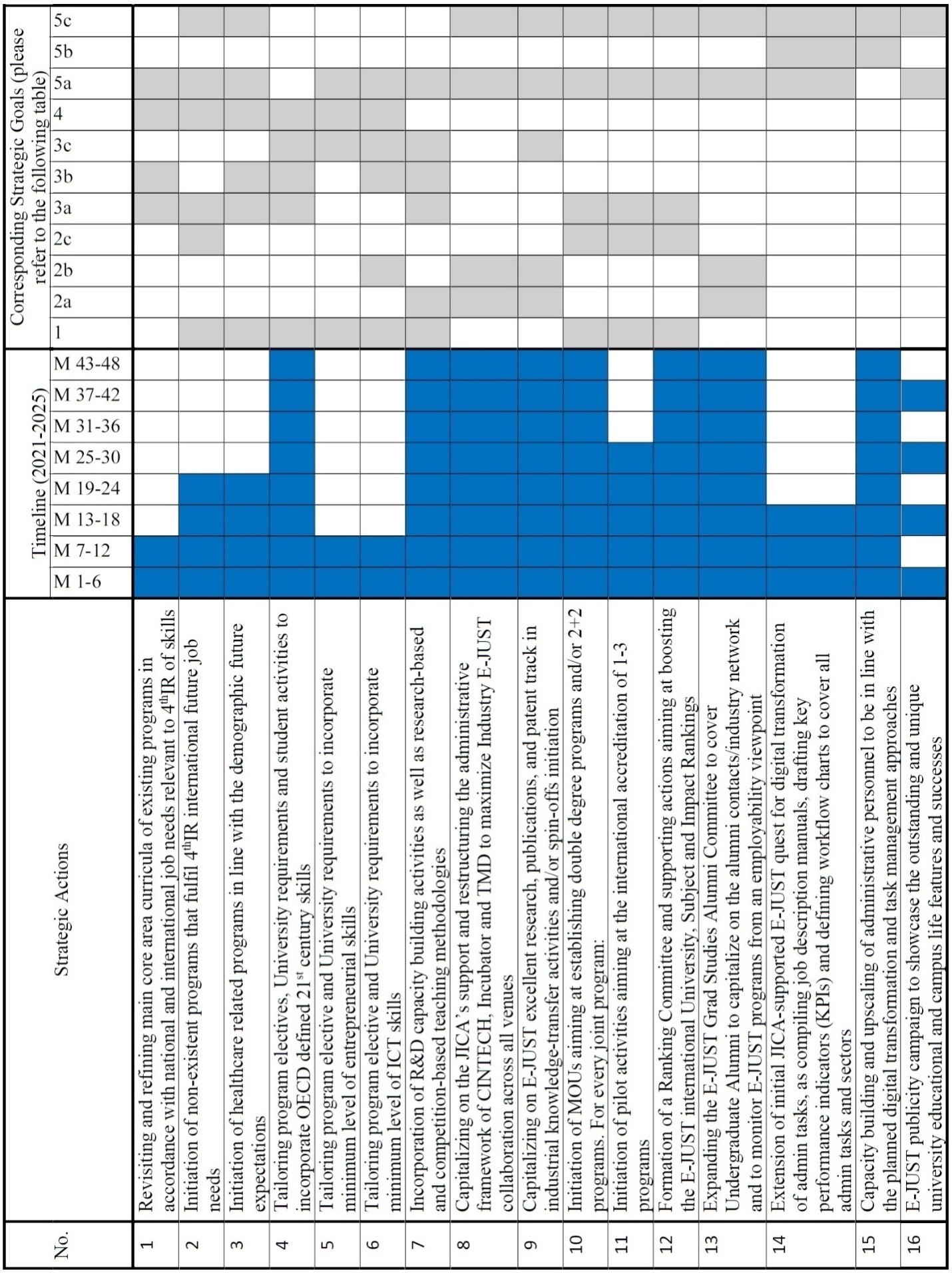 Strategic Plan Framework SummaryThe Strategic Plan (SP) under consideration has been compiled by adopting a top-down approach in order to maximize the rightfully anticipated E-JUST role in supporting Egypt Vision 2030 Goals, UN Sustainable Development Goals (SDGs) and Africa Agenda 2063. Since nowadays many international (including Japanese) and regional attributes do affect national education ecosystems, issues such the Fourth Industrial Revolution (4th IR) and different worldwide demographic expectations had to be taken into consideration. It should be stated that while composing this SP, pertinent and crucial data has been utilized and extracted from a considerable number of recently published international organizations relevant reports. Examples of these reports include United Nations Educational, Scientific and Cultural Organization (UNESCO), United Nations Industrial Development Organization (UNIDO), International Labor Organization (ILO), Organization for Economic Co-operation and Development (OECD), World Bank (WB), World Economic Forum (WEF), and McKinsey & Partners.